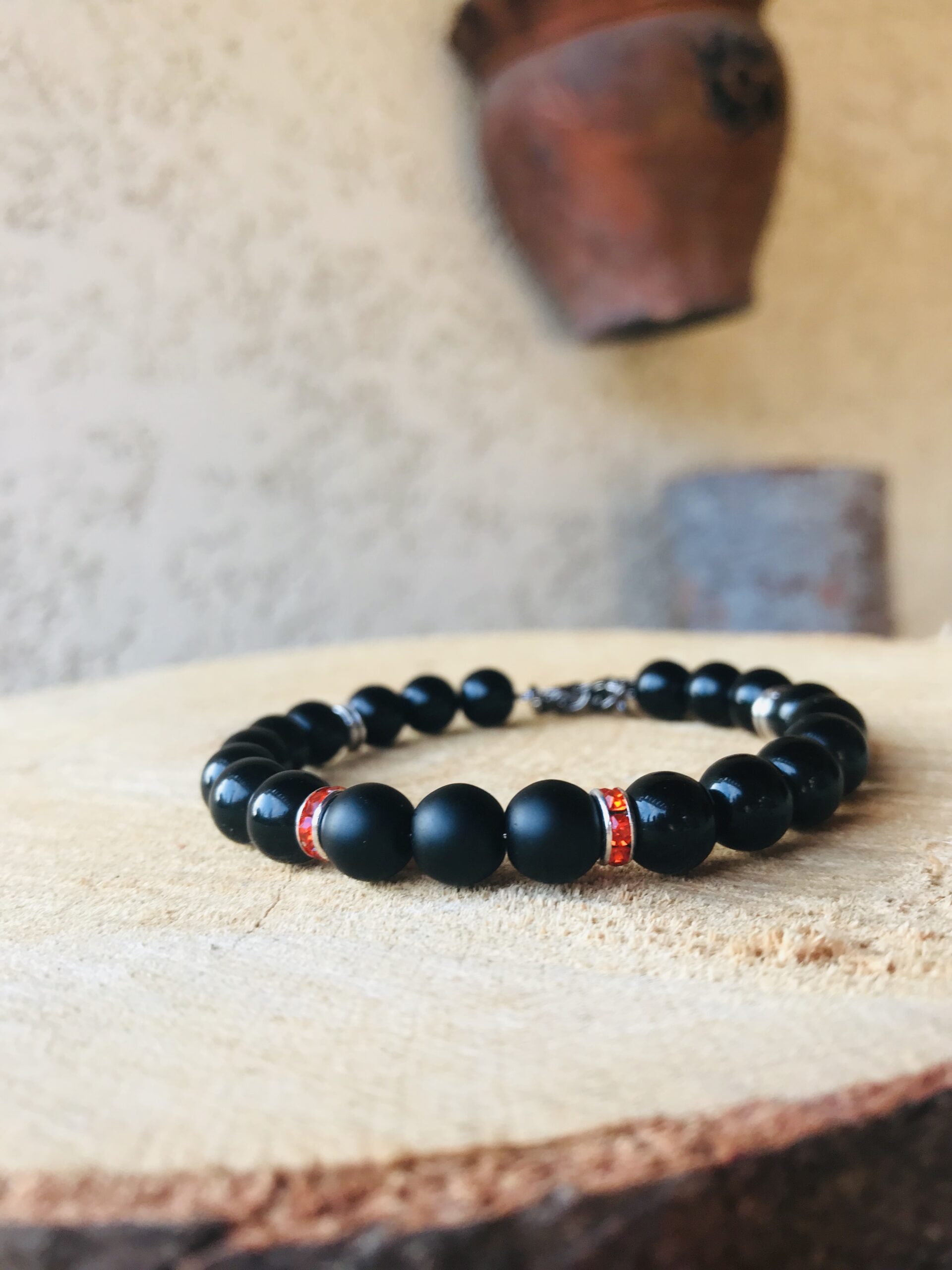 Base de bracelet avec les perles noires brillantes et mates avec des elements brillants rouge